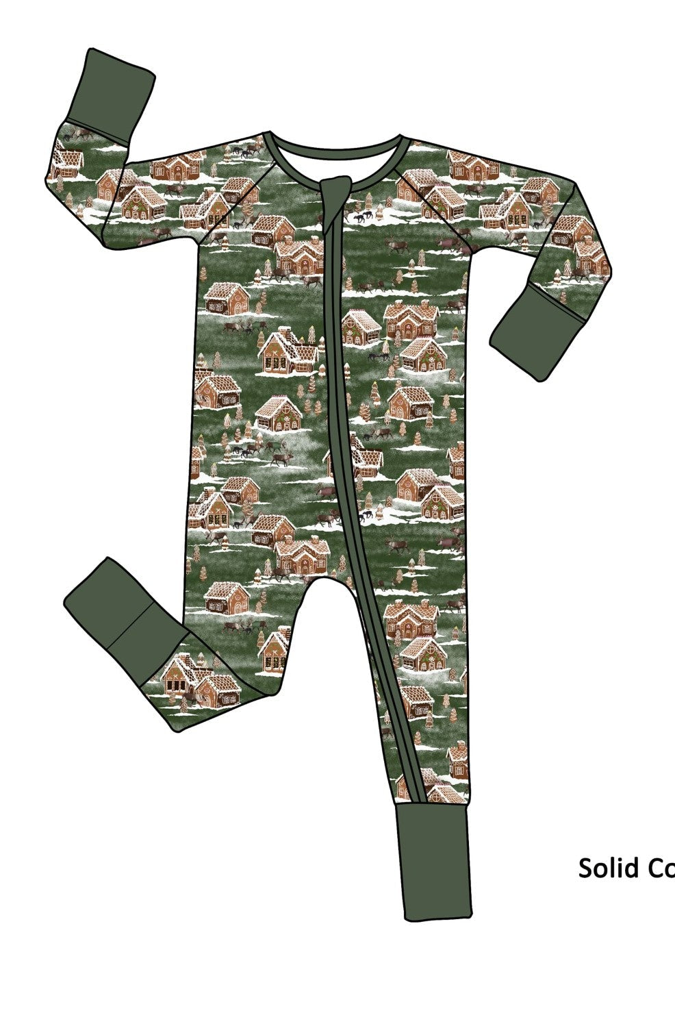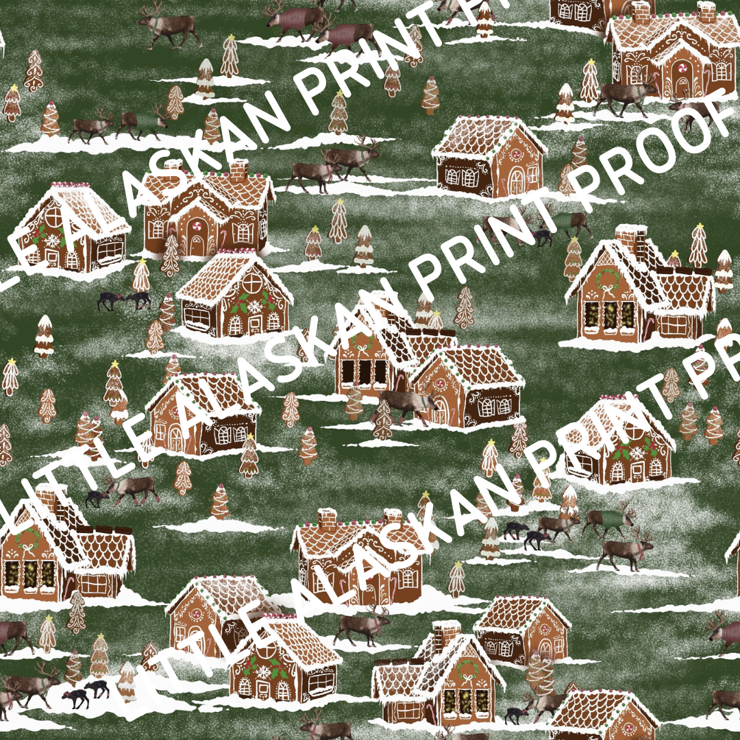 Wrap your little one in the magic of an Alaskan Christmas with this enchanting holiday print. Set against a deep forest-green background, the design features cozy gingerbread cottages dusted with snowy rooftops, frosted pine trees decorated like sugar cookies, and gentle herds of reindeer wandering through the wintry village. The whimsical mix of gingerbread details and woodland charm brings together the sweetness of Christmas baking with the wonder of Alaskan wildlife.